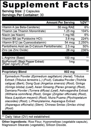 Ingredients:Vitamin A (as Beta-Carotene), Thiamin (as Thiamin Mononitrate), Niacin (as Niacin), Vitamin B6 (as Pyridoxine HCI), Vitamin B12 (as Cyanocobalamin), Pantothenic Acid (as D-Calcium Pantothenate), Zinc (as Zinc Oxide), L-Arginine (Base), BioPerine® (Black Pepper Extract) (Piper nigrum) (Fruit), Epimedium Powder (Epimedium sagittatum) (Aerial), Tribulus Extract (Tribulus terrestris L.) (Fruit), Catuaba Powder (Trichilia catigua) (Bark), Dong Quai (Angelica sinensis) (Root), Ginkgo (Ginkgo biloba) (Leaf), Asian Ginseng (Panax ginseng) (Root), Damiana Powder (Turnera diffusa) (Leaf), Ashwagandha Extract (Withania somnifera) (Root), Ginger (Zingiber officinale) (Root), Maca (Lepidium meyenii) (Root), Muira Puama (Ptychopetalum olacoides) (Root), L-Phenylalanine, Asparagus Extract (Asparagus officinalis) (Stem), Chinese Smilax (Smilax china) (Root).